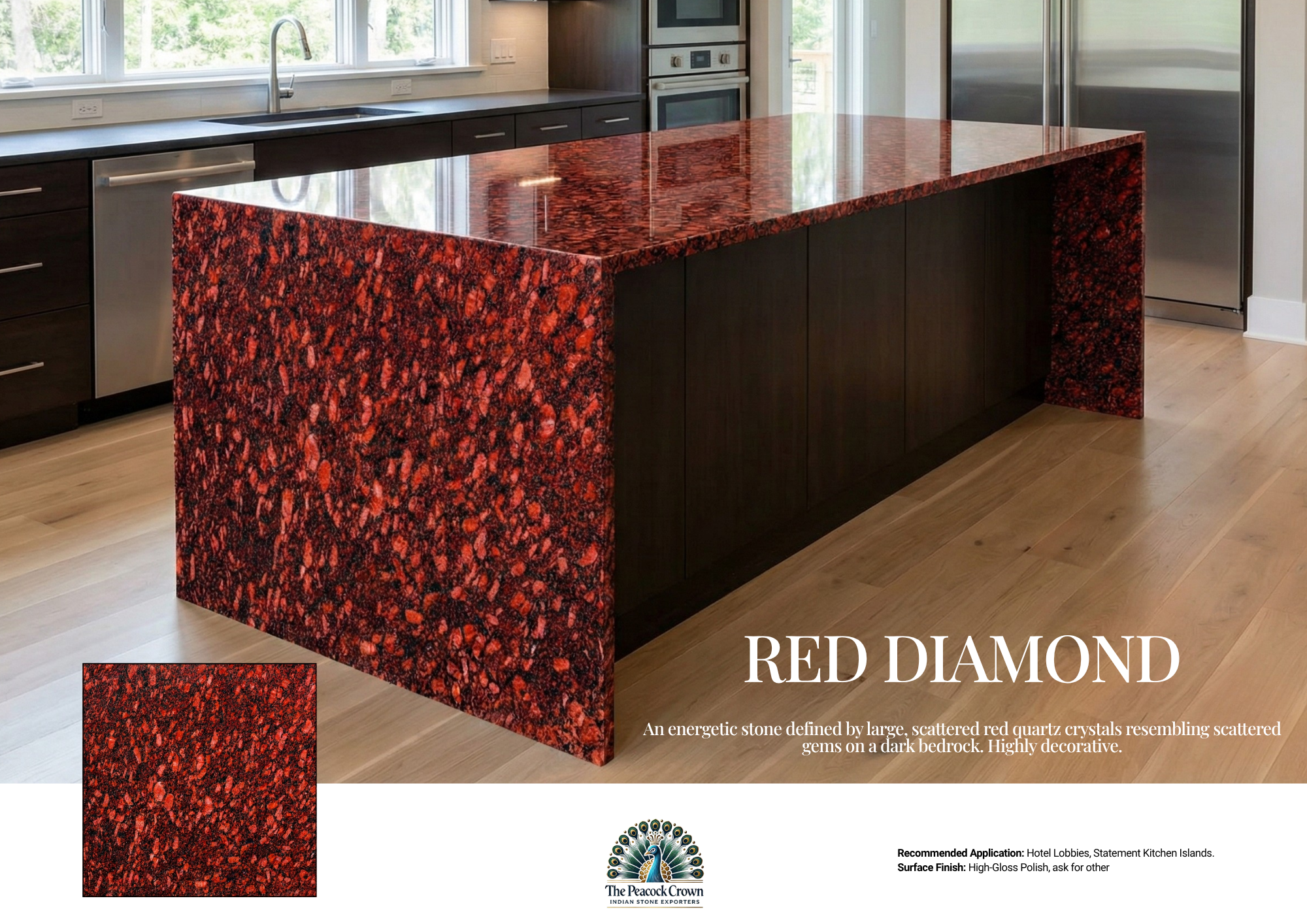 Visual Character: An energetic stone defined by large, scattered red quartz crystals resemling scattered gems on a dark bedrock. highly decorative.